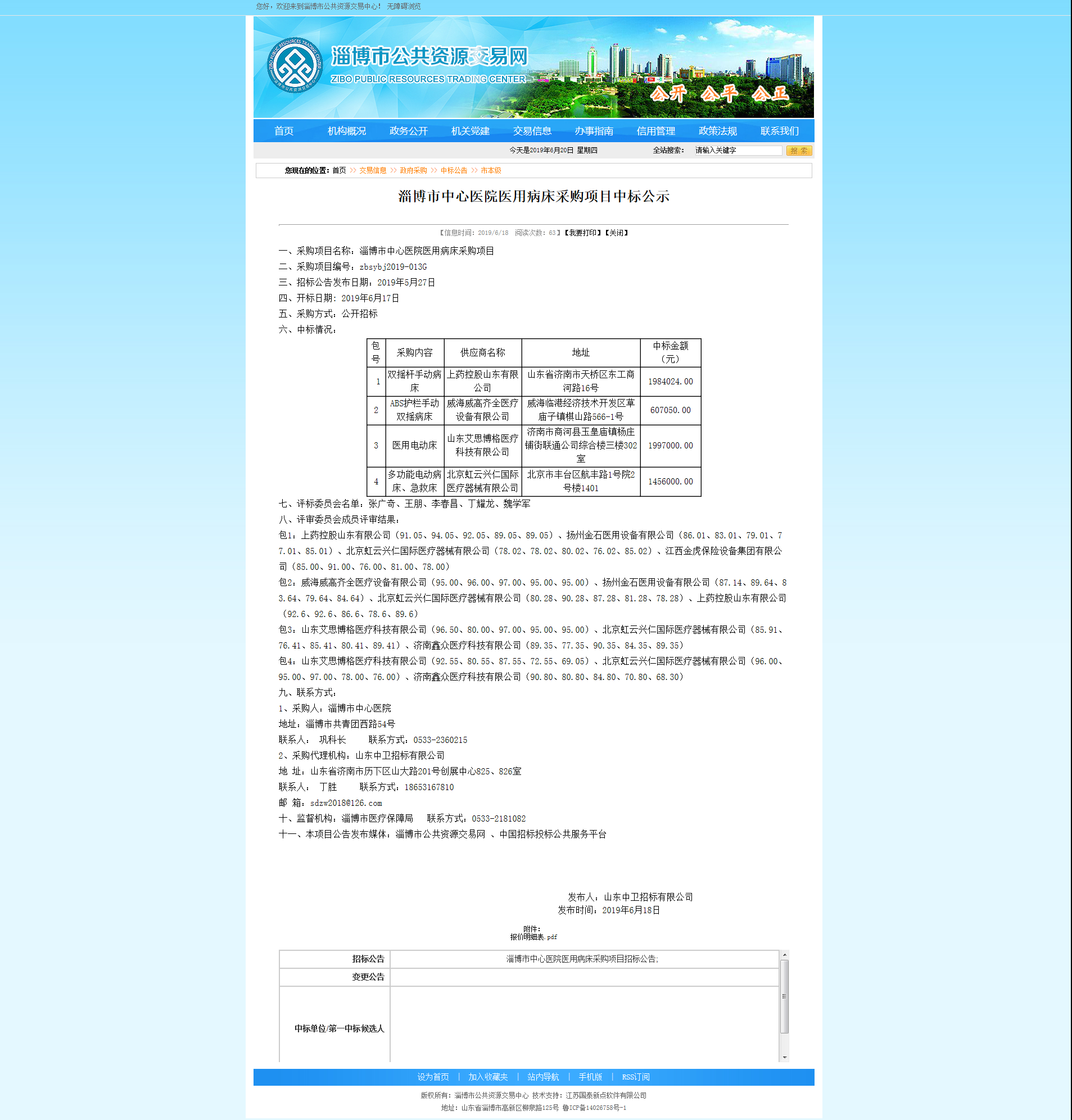 淄博市中心医院医用病床采购项目中标公告