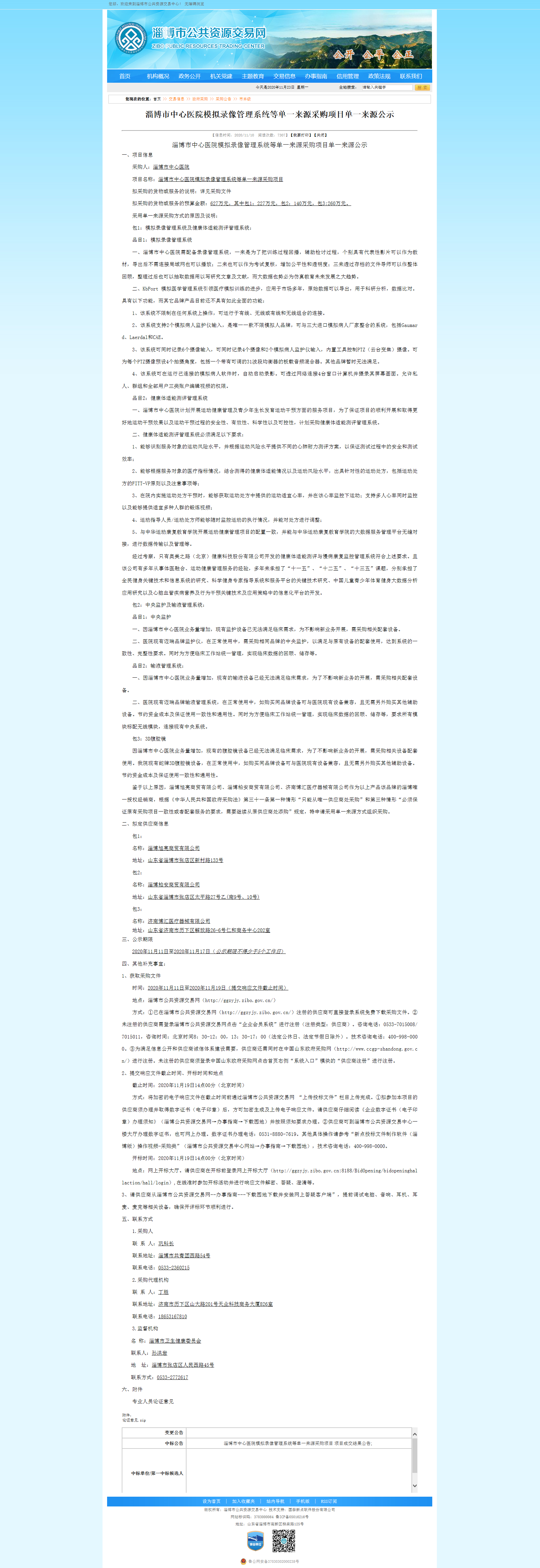 淄博市中心医院模拟录像管理系统等单一来源采购项目
