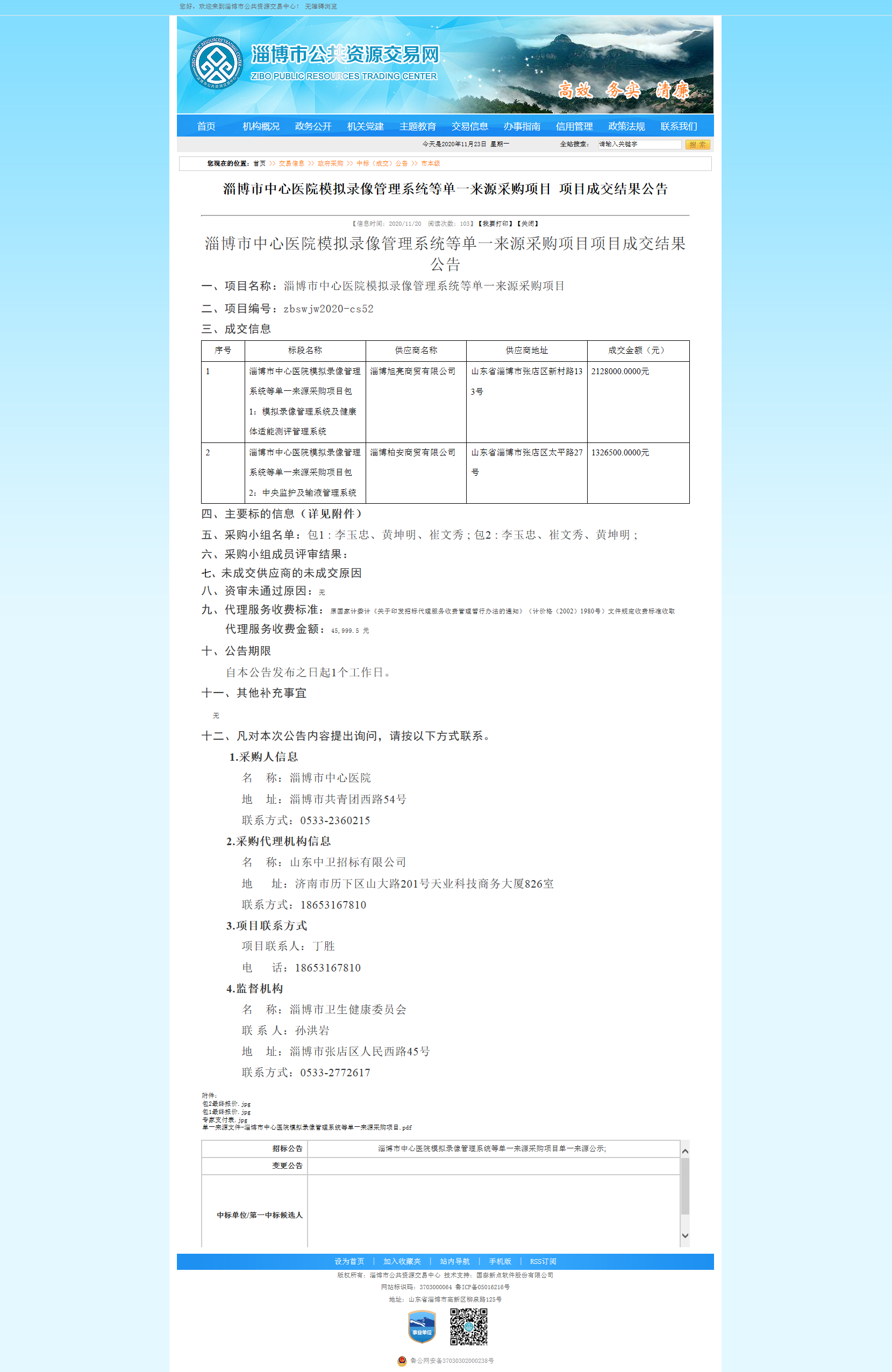 淄博市中心医院模拟录像管理系统等单一来源采购项目成交公告