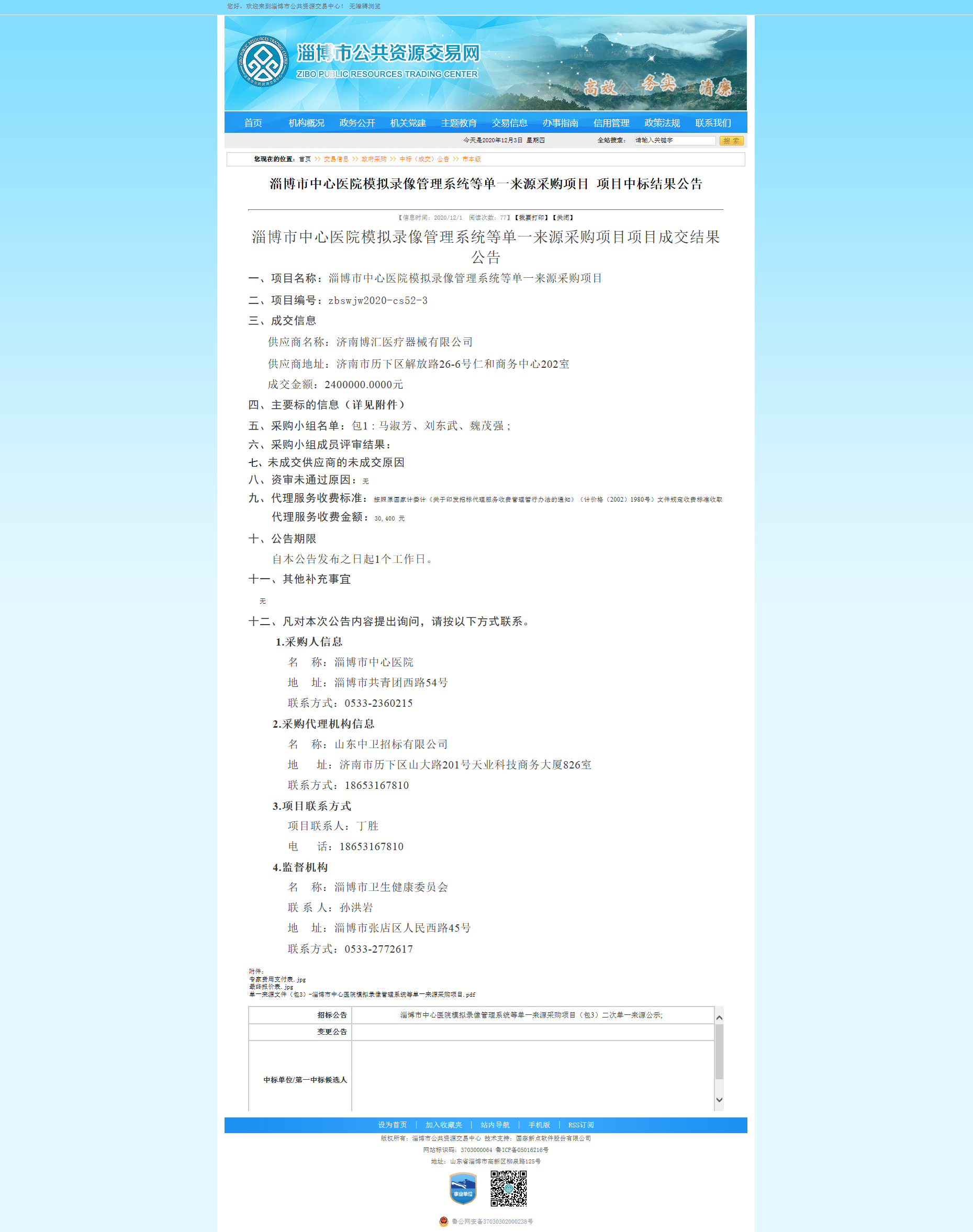 淄博市中心医院模拟录像管理系统等单一来源采购项目(包3)成交结果公告