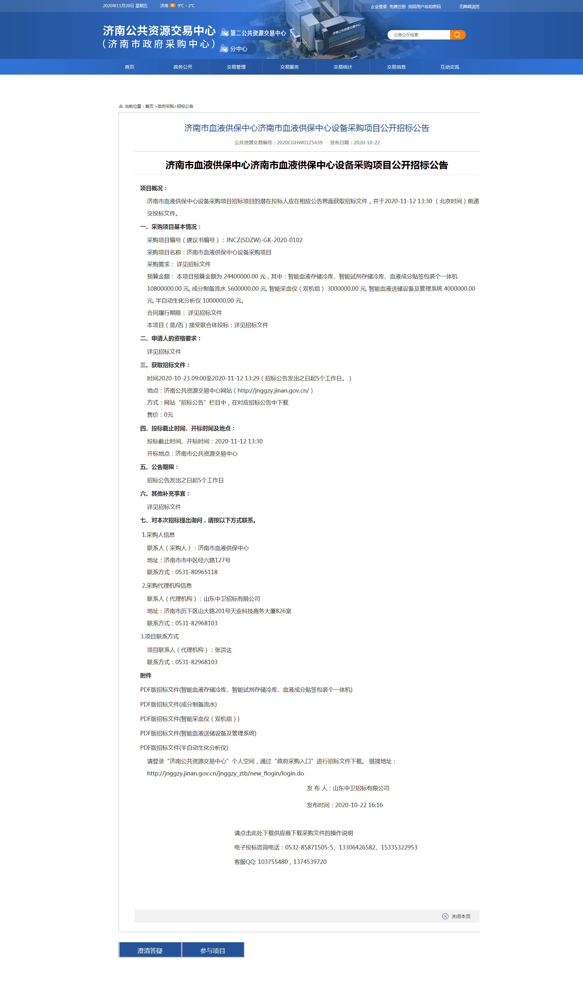济南市血液供保中心设备采购项目公开招标公告