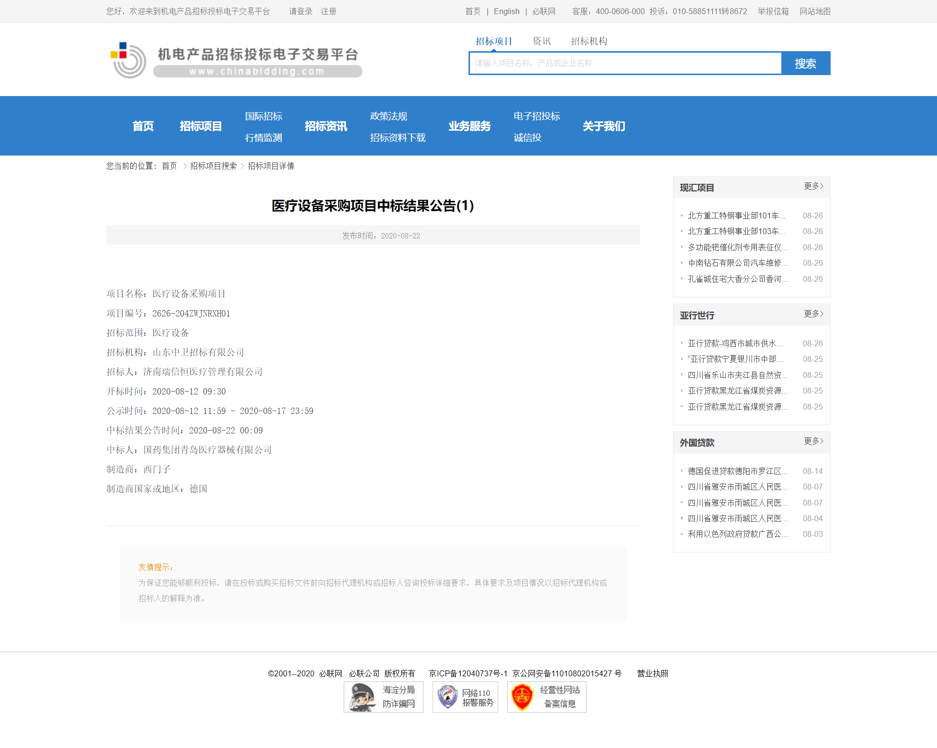 医疗设备采购项目国际中标结果公告