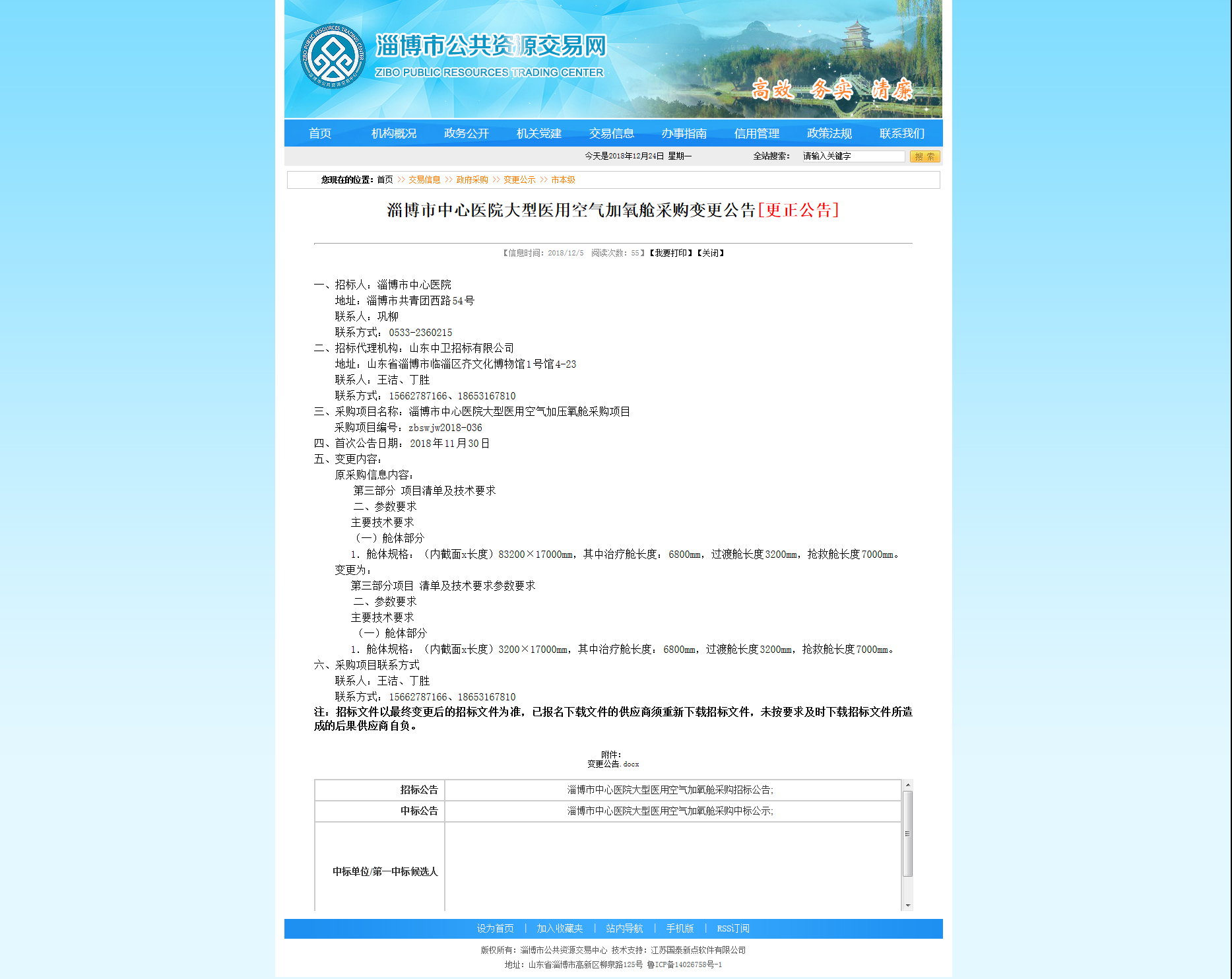 淄博市中心医院大型医用空气加压氧舱采购项目变更公告